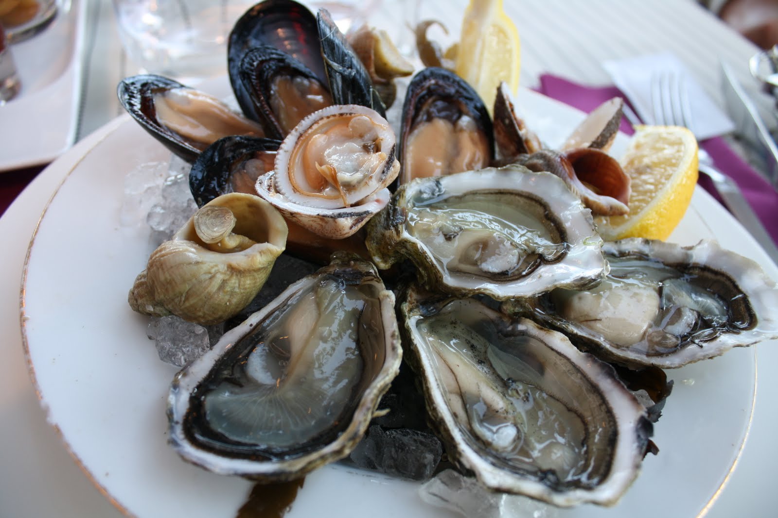 My coquillages appetizer came very nicely presented on ice rocks and another plate on the side with garlic sauce which my husband liked better than aioli sauce, red vinegar with onions (this is exceptional with oysters, I had previously tasted that in Cassis).